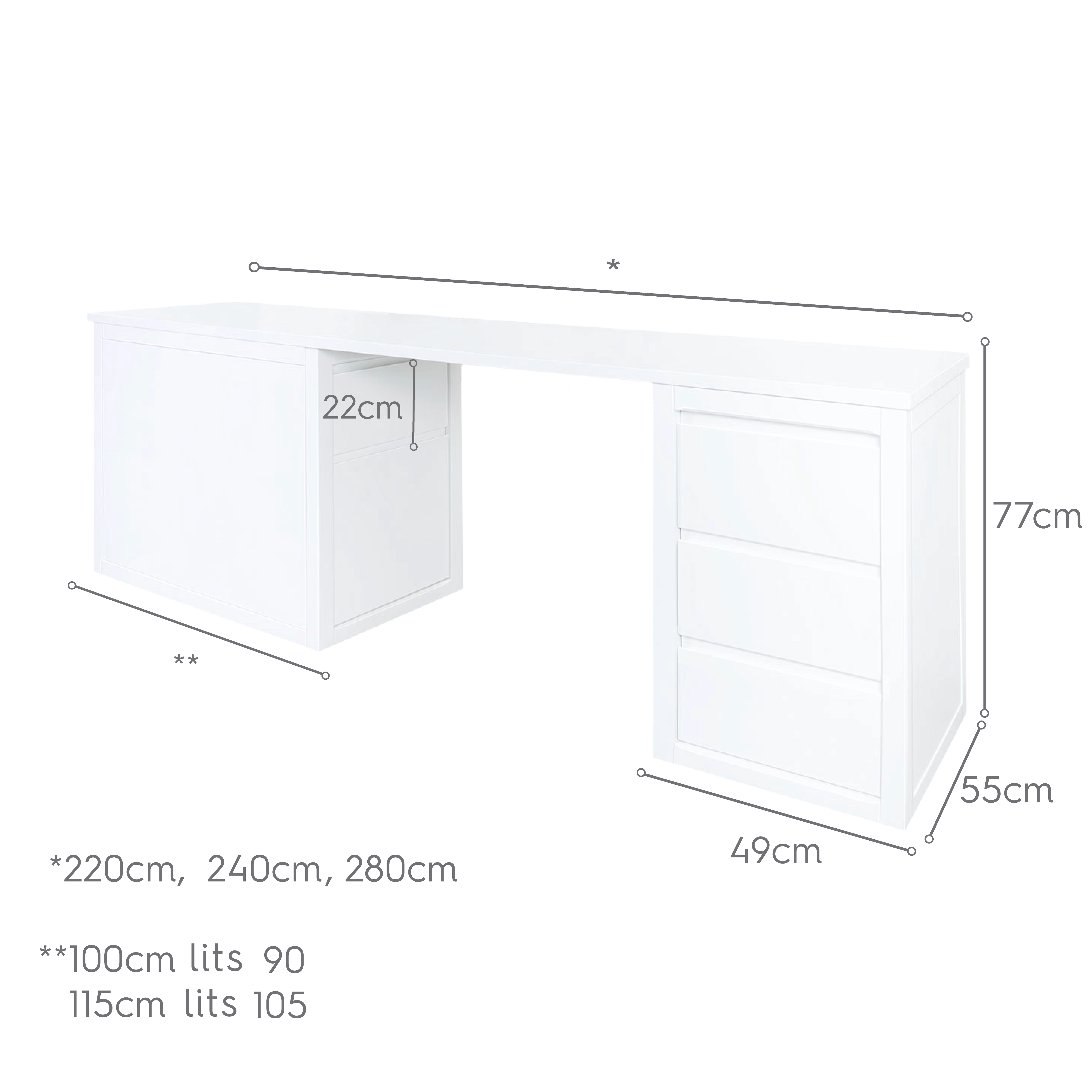Pour lit 100 cm: 115 cm largeur x 49 cm profondeur x 74,5 cm hauteur