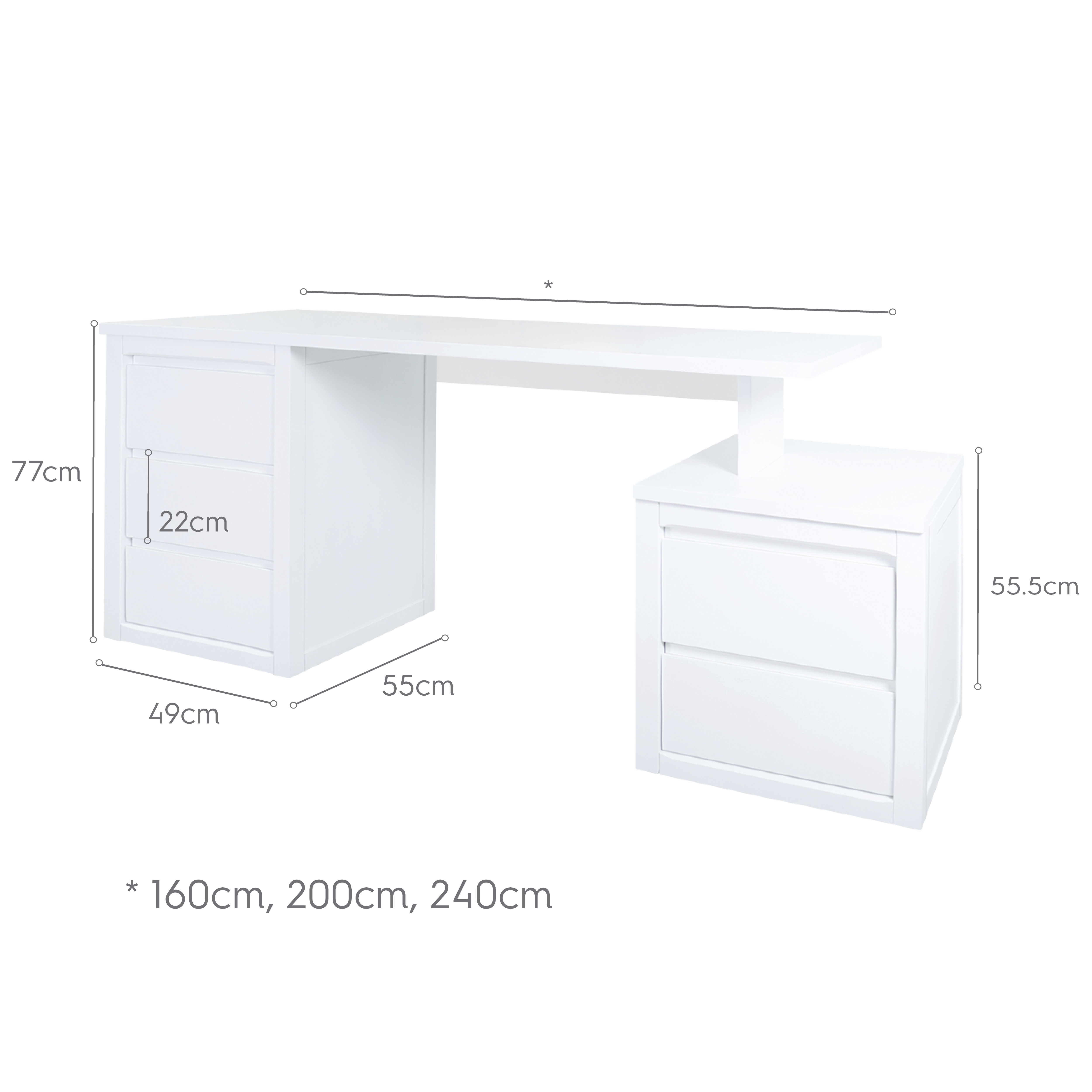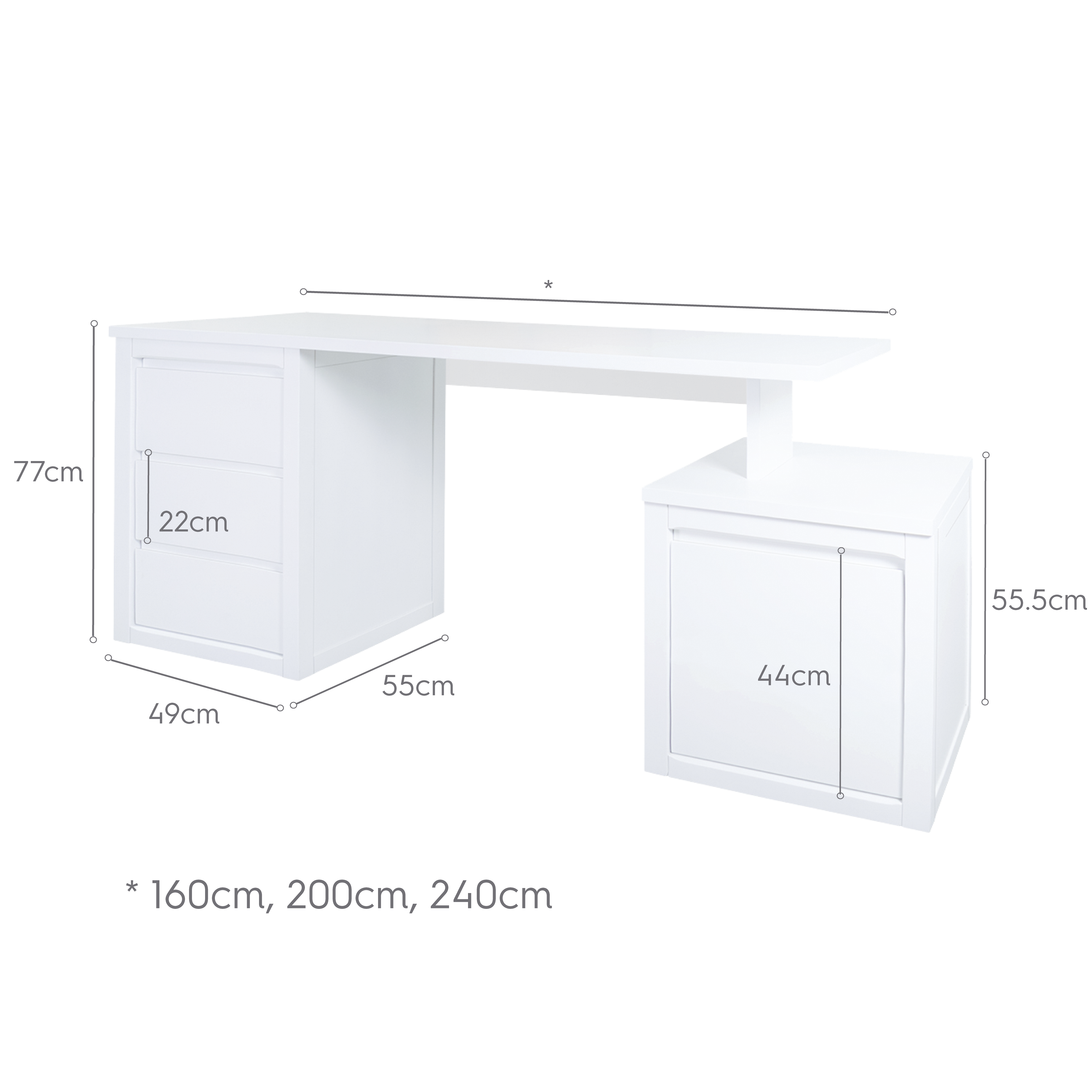 Dimensions plan de travail, 160 cm, 200cm ou 240 cm.