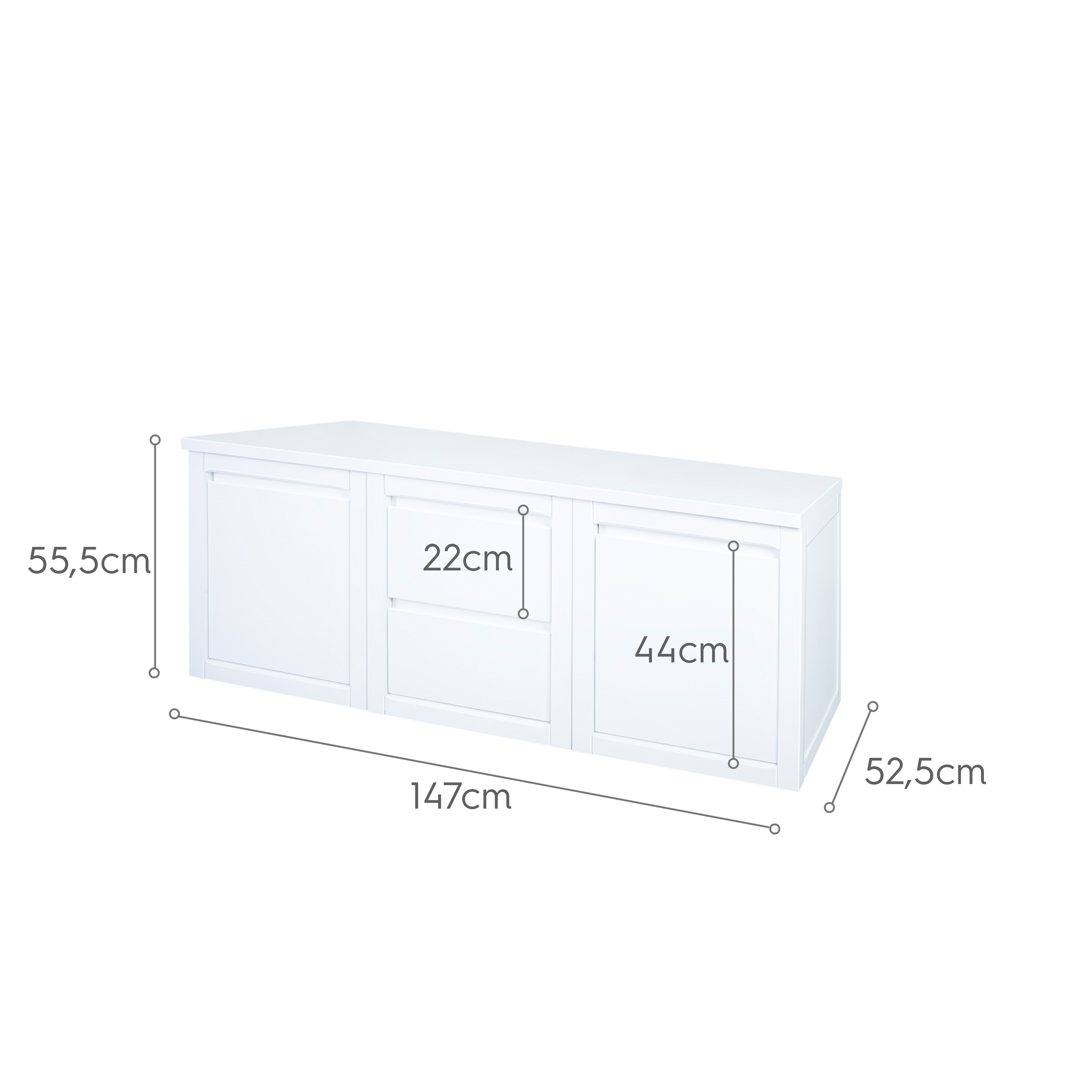 Le banc de rangement triple enfant Linéaire dispose d´un design laqué blanc qui s´associera parfaitement avec le reste du mobilier de n'importe quelle chambre enfant , salle de jeux ou coin jeu dans le salon.