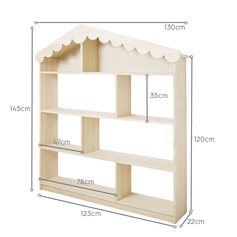 L´étagère enfant cabane en bois naturel est une bibliothèque originale en bois en forme de cabane de poupée comporte plusieurs étagères pour que votre enfant puisse ranger ses livres et jouets préférés.
