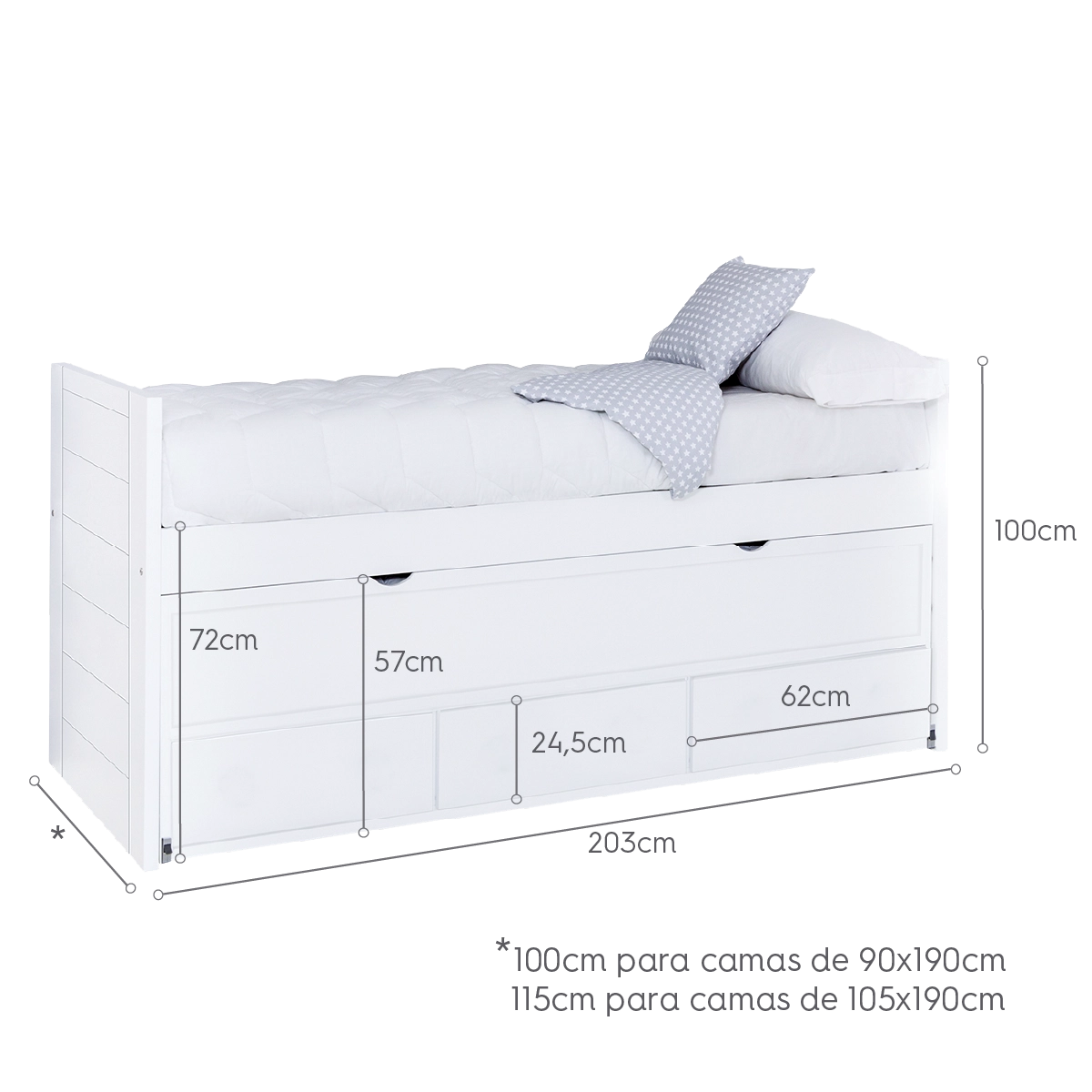• Dimensions du lit: 203 cm L x 100 cm P x 100 cm H