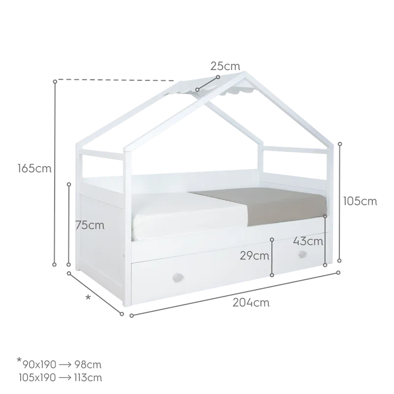 Le Lit gigogne Cabane pour enfant Toit présente une conception différente et unique en MDF laqué blanc.